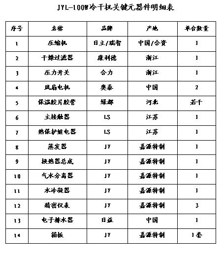 結(jié)構(gòu)冷凍式干燥機本質(zhì)上是一種熱交換設備,任何型式的冷凍式干燥機都是由空氣熱交換系統(tǒng)、制冷系統(tǒng)、氣水分離系統(tǒng)及電氣控制系統(tǒng)等部分組成。制冷系統(tǒng)由冷媒壓縮機、蒸發(fā)器、冷凝器及節(jié)流組件(毛細管或膨脹閥)等組成。含有大量水蒸汽的壓縮空氣主要在蒸發(fā)器里完成汽—液冷凝相變,在氣水分離器里完成液態(tài)水的凝聚與排出,從而獲得干燥的壓縮空氣。所以制冷系統(tǒng)的工作狀況直接決定了冷凍式干燥機的運行情況,而氣水分離器的結(jié)構(gòu)與效率對成品氣的干燥程度(用壓力露點來表示)有至關(guān)重要的影響。空氣熱交換器的設計關(guān)系到冷凍式干燥機的節(jié)能運行,并使壓縮空氣成品氣不致于在機器出口管道內(nèi)結(jié)露。